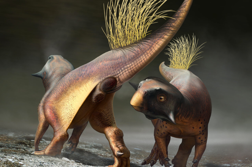 | Representación artística de un Psittacosaurus con plumas filamentosas, que podrían haber tenido un posible uso en la exhibición durante el cortejo. Créditos de la imagen: Andrey Atuching. |